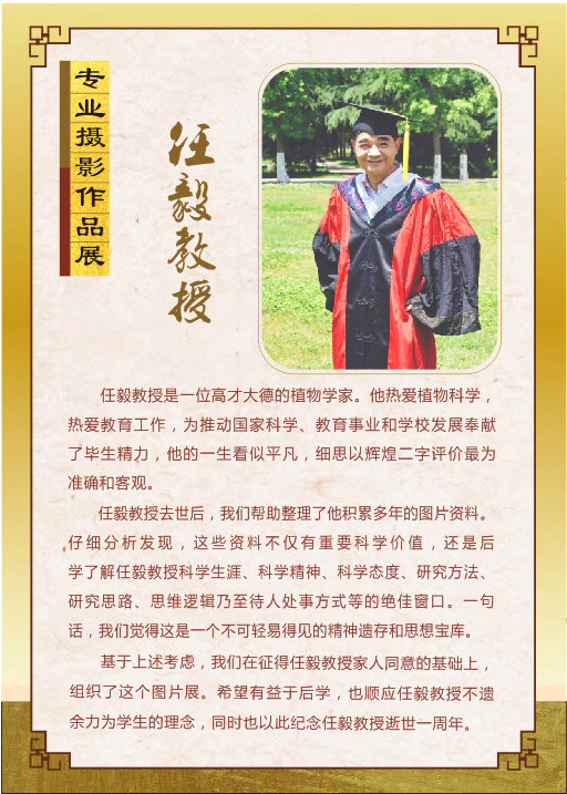 任毅教授坚持20年为各级保护区做植物资源调查和保护区综合考察,一遍遍走入秦岭深处,调查秦岭植物资源本底,是业界知名的“秦岭植物活地图”,在他工作期间拍摄了大量关于花和导管的电镜照片及秦巴山区特有植物的图片,这些图片画面精美,专业性强,具有重要的科学价值。本次展览精选了163张图片,希望将任毅教授热爱科学、热爱教育、严谨治学的精神传递下去,同时也以此纪念任毅教授逝世一周年。
